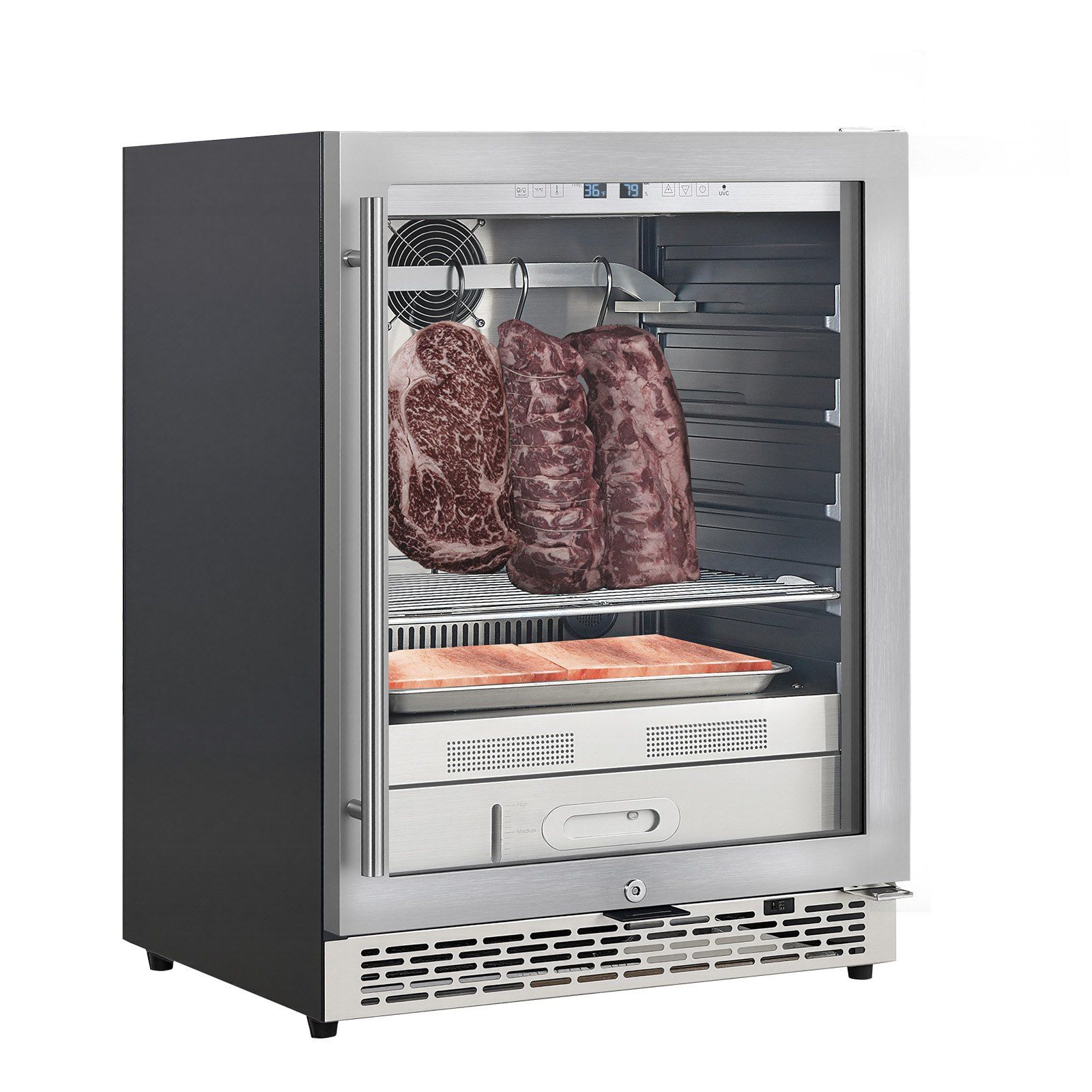 3.Professional-Grade Aging Environment: Featuring UVC sterilization and air circulation system, this meat aging fridge maintains clean air and stable conditions, ensuring consistent, secure aging and enhanced flavor. Includes a lock for peace of mind
