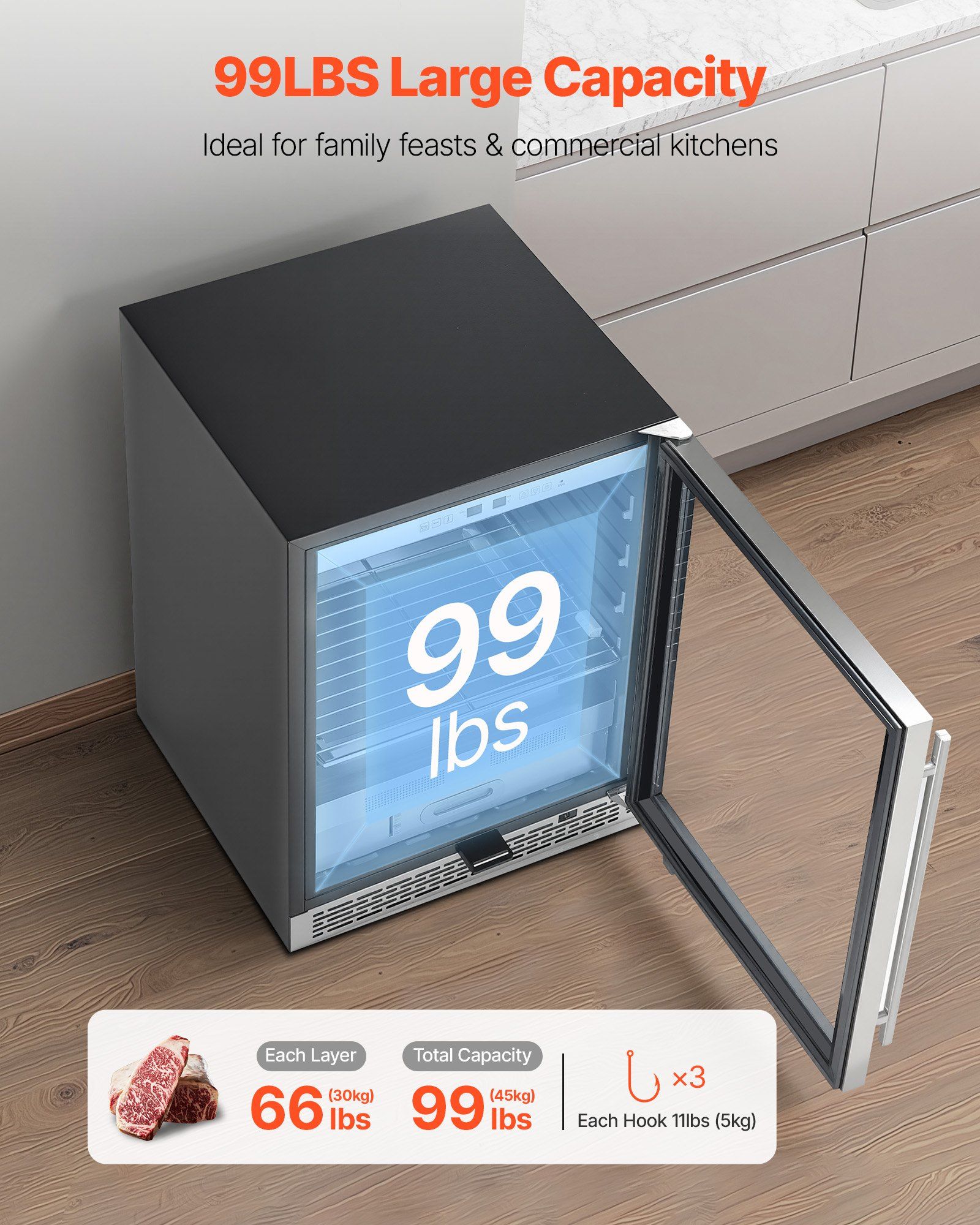 1.99 lbs Large Capacity: This dry aging fridge features removable hooks, shelves, and trays for easy meat organization. Each hook holds up to 11 lbs, each shelf up to 66 lbs, with a total capacity of 99 lbs-ideal for home or commercial use