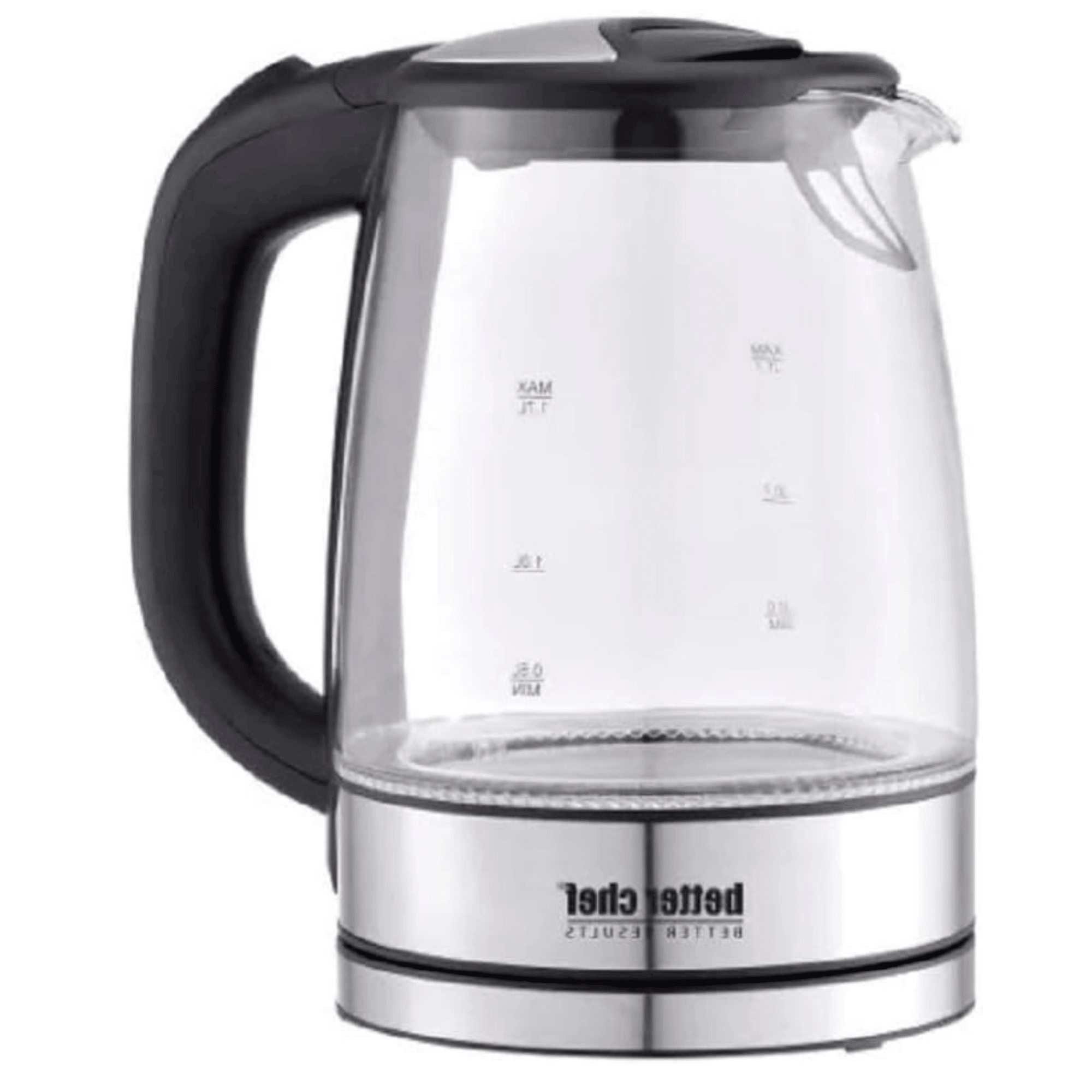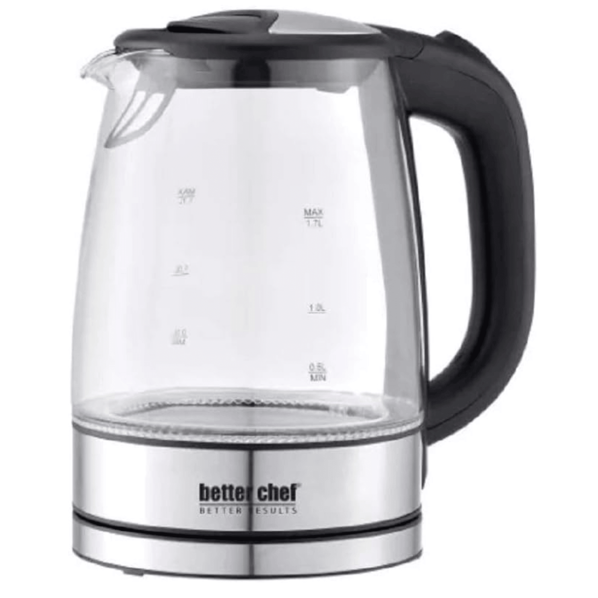 The Better Chef cordless electric glass kettle boasts rapid water boiling capabilities, outperforming traditional stove or microwave methods. It features a convenient thumb-control on/off switch for effortless operation. Crafted from BPA-free stain-resistant Borosilicate glass, the container ensures safe and clean water boiling. With a generous capacity of 1.7 liters or 7.2 cups, it can accommodate various hot water needs. An added feature includes blue LED lights that illuminate when the unit is heating, providing visual cues. The kettle is equipped with a sealed heating element for enhanced safety and longevity. Additionally, it incorporates a boil-dry auto-shutoff function to prevent damage when the water level is low. The cool-touch handle ensures safe handling, even when the kettle is hot, and the 360-degree cordless serving system allows for convenient pouring from any angle.