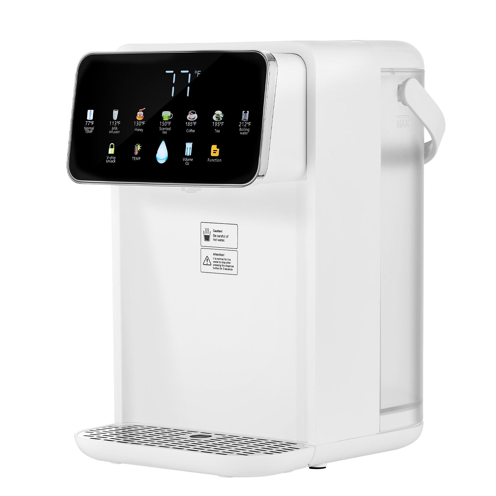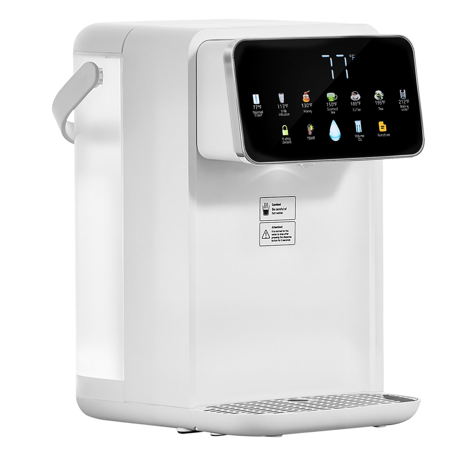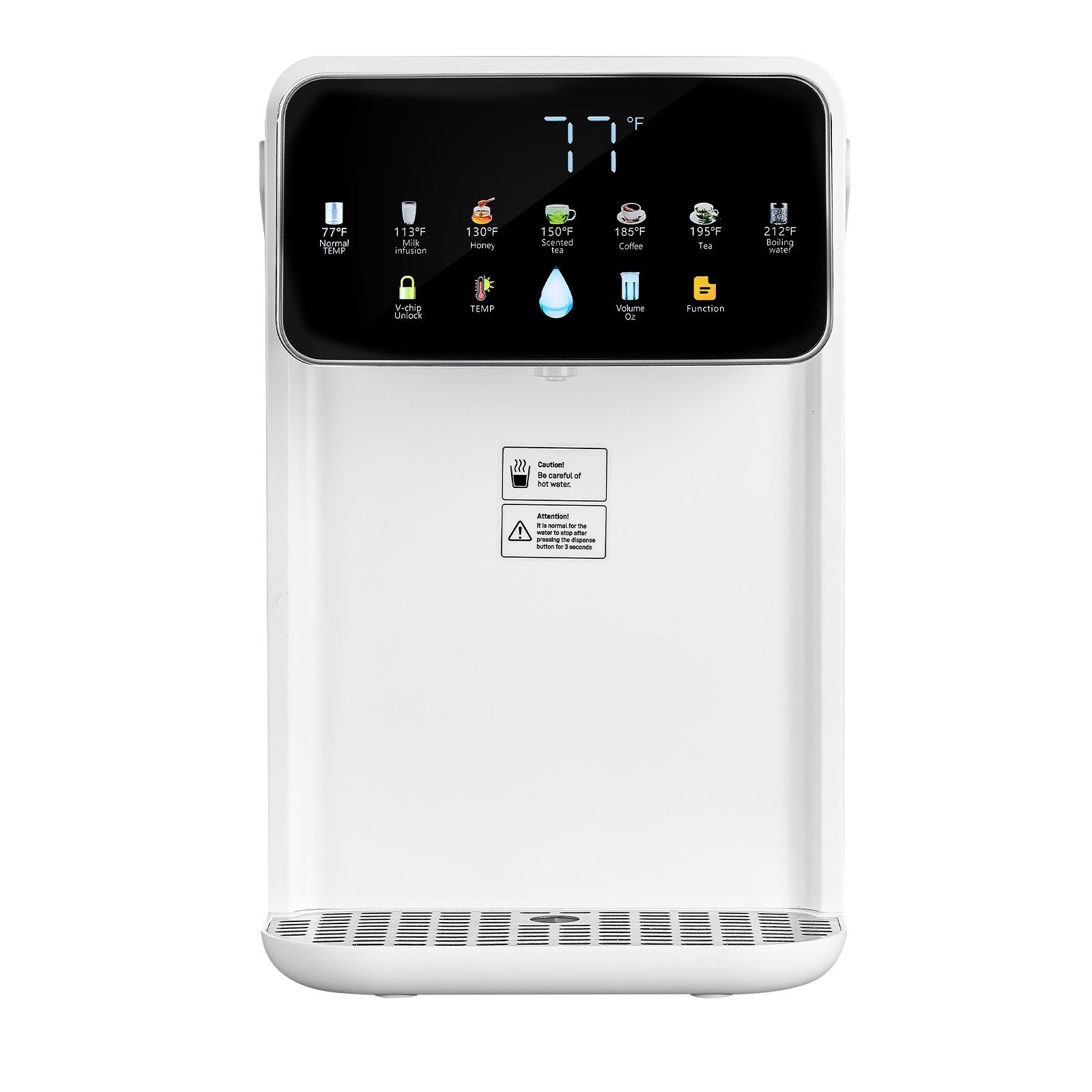 2.7 Temperatures & 7 Water Volumes: This countertop water dispenser offers precise temperature control with 7 preset temperatures (77 Fahrenheit , 113 Fahrenheit , 131 Fahrenheit , 149 Fahrenheit , 185 Fahrenheit , 194 Fahrenheit , 212 Fahrenheit ), and 7 water volumes (6oz, 8oz, 10oz, 12oz, 14oz, 16oz, 18oz)