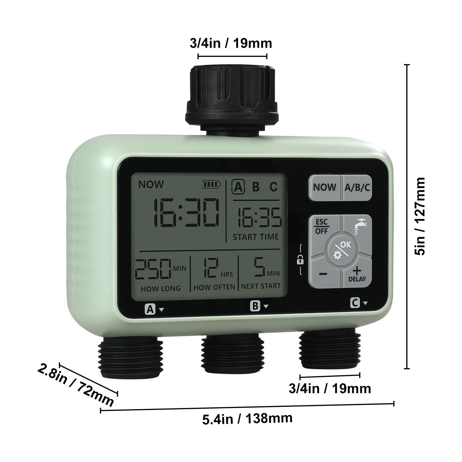 1.3 Independent Watering Zones: Our sprinkler water timer features 3 separate water outlets, each programmable using the ""A/B/C"" buttons. Customize watering schedules for each zone independently, ensuring no interference between them. It allows for efficient management of large-scale irrigation, saving you time and effort in garden or farm maintenance.